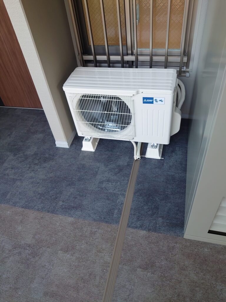 玄関側寝室は、エアコン穴が下になりますので、室内配管が長めになります。室内カバーと屋外カバーを、こちらも施工しております